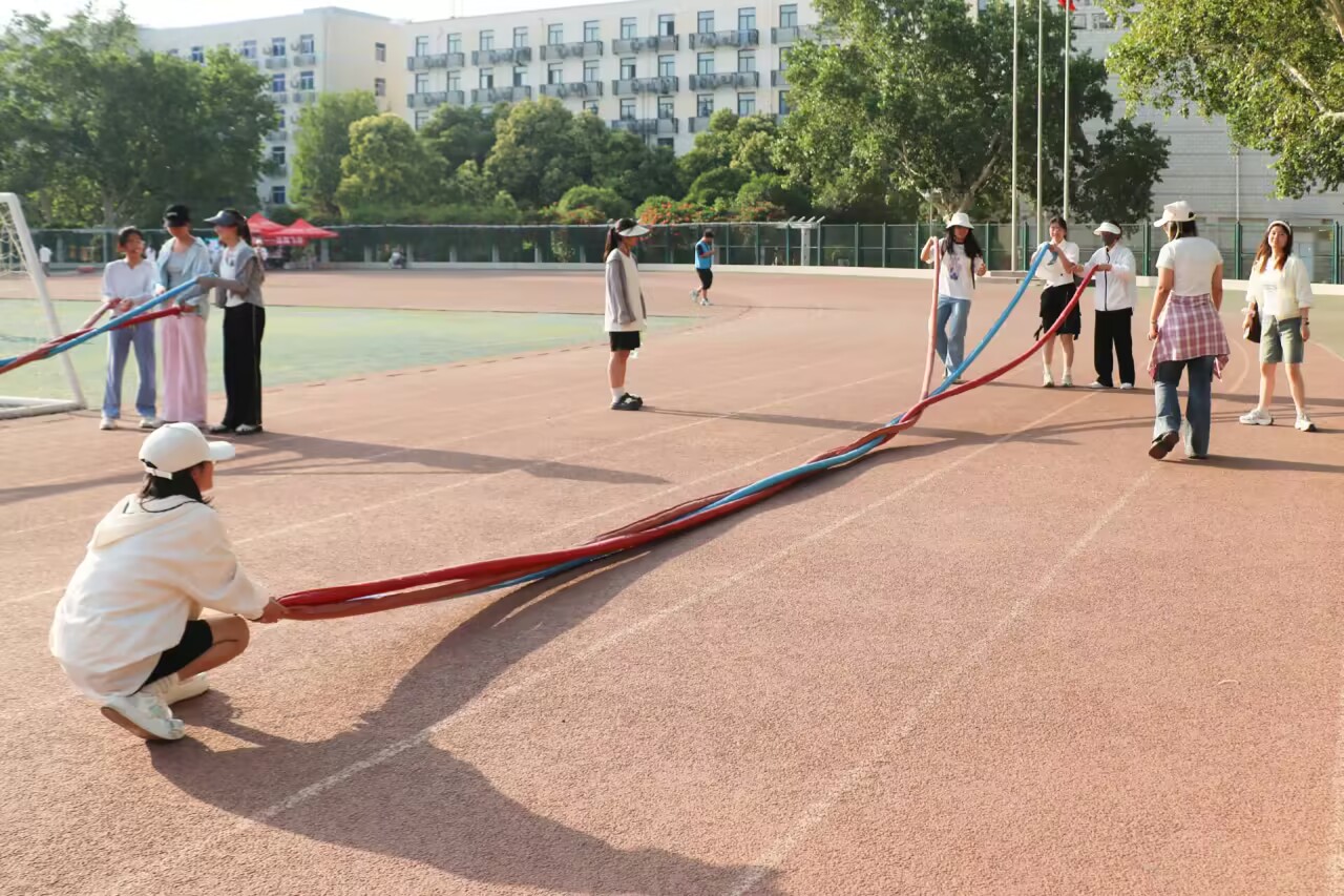 承办的“开心麻花”活动在活力飞扬区开展,凭借独特的趣味性与高强的协作性吸引众多学生积极参与。在“开心麻花”活动中,八人一队的参赛选手们迅速就位,神情专注地等待发令。大家依照编辫顺序,有条不紊地将分管绳索轮流编入中央,双手翻飞间,默契与技巧尽显。现场气氛活跃,各个队伍争分夺秒,加油助威声与绳索摩擦声交织,将团队协作的魅力展现得淋漓尽致。