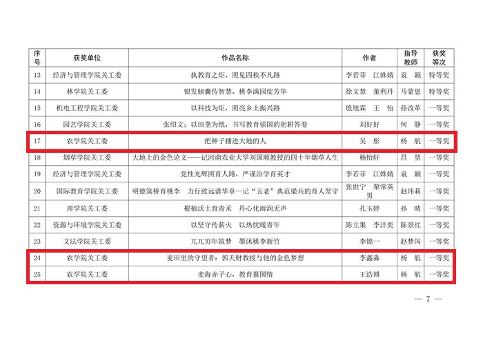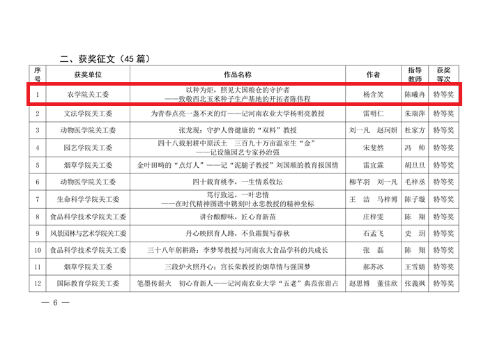 师生佳作频出、捷报连连。其中,由杨含笑撰写,陈曦冉老师指导的征文《以种为炬,照见大国粮仓的守护者——致敬西北玉米种子生产基地的开拓者陈伟程》表现突出,不仅荣获学校特等奖,还拿下河南省教育厅关工委特等奖,更斩获教育部关工委最佳征文奖,成功入围中国教育电视台优秀作品展播。此外,吴彤的《把种子播进大地的人》、李鑫淼的《麦田里的守望者:郭天财教授与他的金色梦想》等10篇征文分别获评学校一、二等奖,刘昱莹等人创作的微视频《玉种传薪 九旬笃行》荣获学校一等奖。a片直播