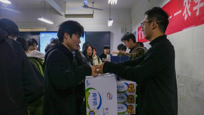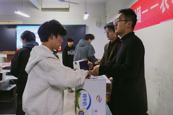 新生代表赠送了悉心筹备的冬季暖心礼,勉励他们奋勇争先、砥砺前行。礼包中的保温壶宛如温暖的陪伴者,牛奶犹如成长的能量源,活动现场暖意融融。