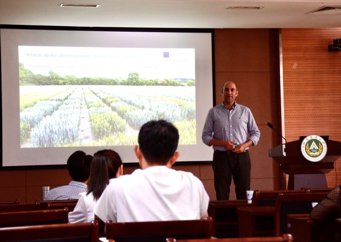 Cristobal Uauy教授用生动的图片和文字解释了小麦叶尖如何通过时间和空间的发展,并详细的介绍了SVP和SEP基因对花器官的发育。一幅幅完美结合了艺术与科学的精美幻灯片、及其循循善诱、栩栩如生的讲授方式给参与报告的师生留下了深刻的印象。王晓明副教授通过利用生物信息工具解析小麦根系发育相关基因挖掘与基因互作方向的最新研究科研进展,为开展相关领域研究的工作拓展了思路。报告后的问答环节中,Cristobal Uauy教授、王晓明副教授、肖军研究员与参与报告的师生就报告相关研究进行了具体的交流及讨论。