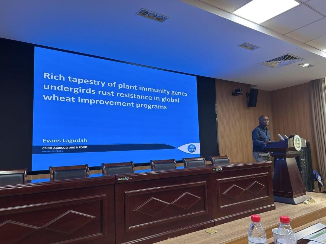 Lagudah院士及Singh博士先后以“Achieving durable rust resistance in practice”和“Rich tapestry of plant immunity genes undergirds rust resistance in global wheat improvement programs”为题开展了第八期CIMMYT-中国小麦玉米科学创新国际论坛主题报告。Singh博士分享了CIMMYT在抗病性基因挖掘、适应性品种推广及发展中国家技术援助方面的实践经验。Lagudah院士则系统介绍了其团队在小麦抗锈病关键基因领域的突破性研究成果。他通过基因编辑技术、分子标记辅助选择等案例,阐释了如何将基础研究转化为实际育种工具,并系统的总结了该领域已报道抗性基因种类及其应用。通过多基因聚合策略实现抗性遗传模块的协同表达,可使植株建立广谱抗病屏障并达到近乎完全免疫的状态,这为应对病原体快速进化及毒性变异挑战提供了关键解决方案。我校a片直播 、生命科学学院部分师生与专家就相关议题展开了交流与讨论。