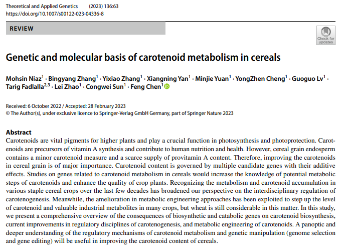 类胡萝卜素是维生素A合成的前体和对人类营养和健康具有重要作用。然而谷物籽粒中的类胡萝卜素含量较少,因此开展类胡萝卜素相关研究具有重要意义。在这项研究中,我们针对类胡萝卜素生物合成通路的基因和分解代谢基因的提出了一个全面的概述,以及现阶段对类胡萝卜素相关基因的改善和相关代谢调控。对类胡萝卜素的调控机制有更深入的代谢了解和遗传操作(基因组选择和基因编辑)将有助于改善谷物的类胡萝卜素含量。a片直播