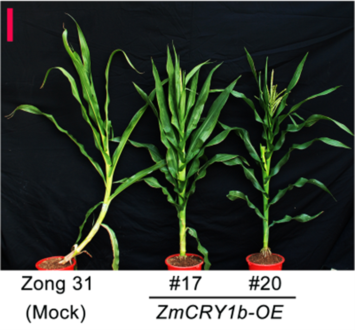 本网讯(通讯员 杨建平 杨青华 贾晓琳)玉米(Zea mays L.)是世界范围内最重要的粮食作物之一,并且随人口的增加和生活质量的提高,人类对玉米的需求量日益激增。现阶段玉米增产最主要的措施是提高种植密度,例如我国北方春玉米区种植密度在2005—2016 的12 年间提高了 1.5 万株/hm2(增加30%以上)。但是随着种植密度的增加,导致玉米因相互遮光郁敝株高和穗位升高并变弱,从而降低其抗倒伏能力。隐花色素CRY是植物的蓝光受体,负责调控植物生长发育和开花期等。然而,玉米ZmCRY1在玉米生长发育和农艺性状中的调控作用,尚不清楚。