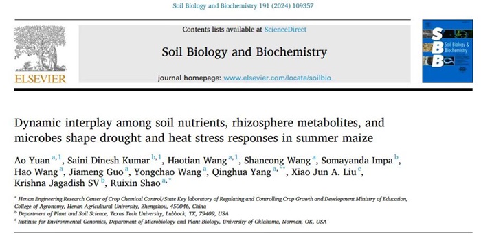 杨青华/邵瑞鑫教授团队在土壤科学领域顶级期刊《Soil Biology and Biochemistry》(中科院一区TOP,IF=9.7)在线发表了题为“Dynamic interplay among soil nutrients, rhizosphere metabolites, and microbes shape drought and heat stress responses in summer maize”研究型论文。该成果为团队近年在玉米逆境生理调控方面继《Journal of Hazardous Material》、《Field Crops Research》、《Agriculture, Ecosystems and Environment》、《Science of the Total Environment》、《Ecotoxicology and Environmental Safety》的又一重要成果。