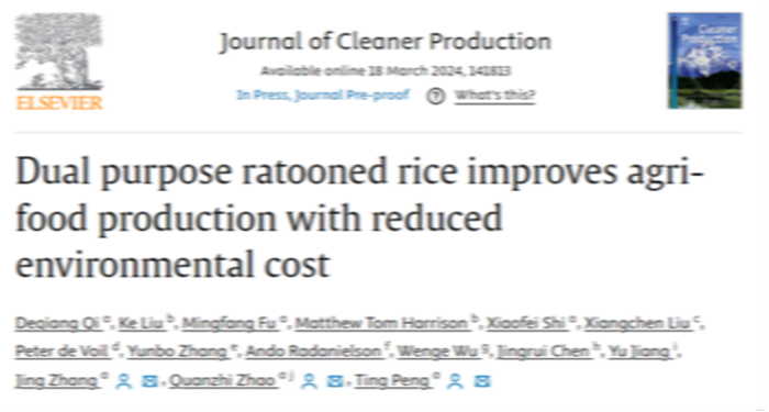 水稻生物学科技创新团队的彭廷教授、张静教授与贵州大学赵全志教授团队合作,在粮饲型再生稻环境和经济效益评价领域取得重要进展,相关研究结果以“Dual purpose ratooned rice improves agri-food production with reduced environmental cost”为题发表在环境科学权威期刊《Journal of Cleaner Production》上。