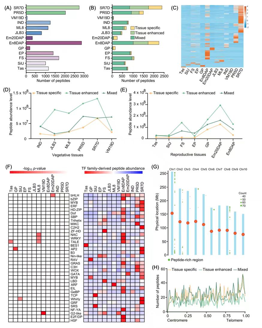 内源小肽,通常由2到100个氨基酸组成,作为植物生长、发育和胁迫响应的重要调节因子,正受到越来越多的关注。这些小分子物质在多种生物过程中发挥重要作用,包括细胞信号传导、生长调控和防御反应。然而,迄今为止,对植物内源肽的研究主要集中在单个小肽,而且通常仅关注其在特定生物过程中的功能。通过组学能够对生物体生命活动规律进行系统性的研究,然而,目前组学研究主要集中在基因组、转录组和蛋白质组研究。这些研究为揭示基因或者蛋白在各种生物学过程中的作用提供了新的视野,同时也揭示了植物发育或者逆境响应过程中复杂的调控网络。然而,相对于基因组、转录组和蛋白质组,多肽组的研究相对滞后,尚未在植物全基因组范围内对植物整个生长发育期进行系统的研究。
