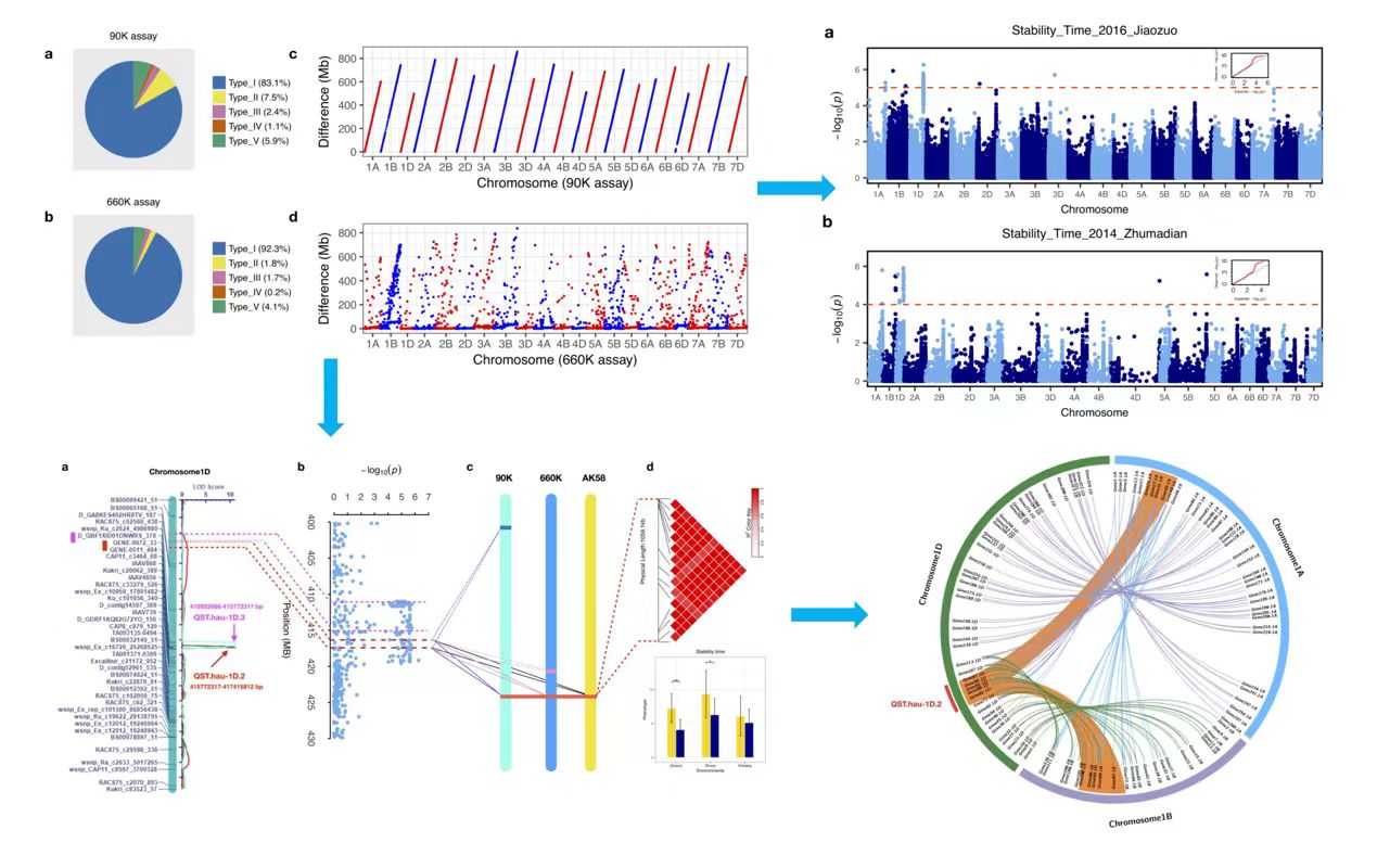 陈锋教授团队联合中国农科院作科所何中虎、高丽锋团队,在国际著名学术期刊Journal of Advanced Research(IF=11.4)在线发表了题为“Reconciliation of wheat 660K and 90K SNP arrays and their utilization in dough rheological properties of bread wheat”的研究论文。该研究基于矮抗58高质量参考基因组,融合更新了小麦660K与90K SNP芯片标记并将其应用于面团流变学特性研究,通过全基因组关联分析(GWAS)、QTL定位、共线性分析、基因表达量分析等手段,定位到多个调控小麦流变学特性的重要遗传区段,并预测了控制面团稳定时间的7个候选基因,找出了优异单倍型,为小麦品质性状改良提供了重要基因资源。