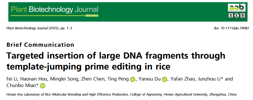 水稻创新团队在植物学领域权威期刊《Plant Biotechnology Journal》上发表了题为“Targeted insertion of large DNA fragments through template-jumping prime editing in rice”的研究论文。该研究在水稻中建立了高效的基因组大片段DNA靶向插入的方法,实现了数百个碱基对的精准插入和替换,极大扩展了引导编辑(Prime Editing, PE)技术在植物中的应用范围,为作物育种提供了强有力的基因编辑工具。