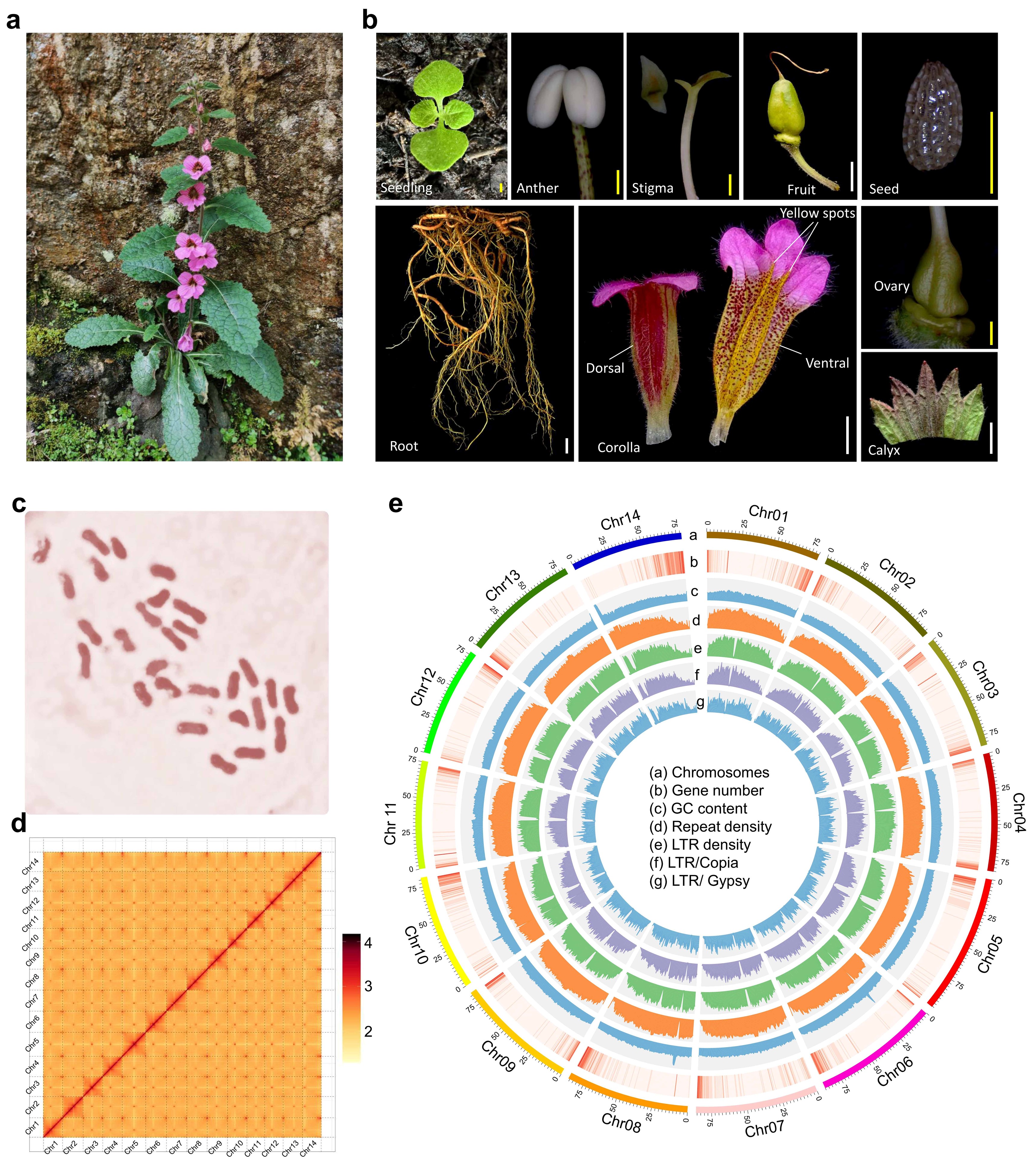 图1 天目地黄形态特征、染色体计数、HiC图及基因组特征