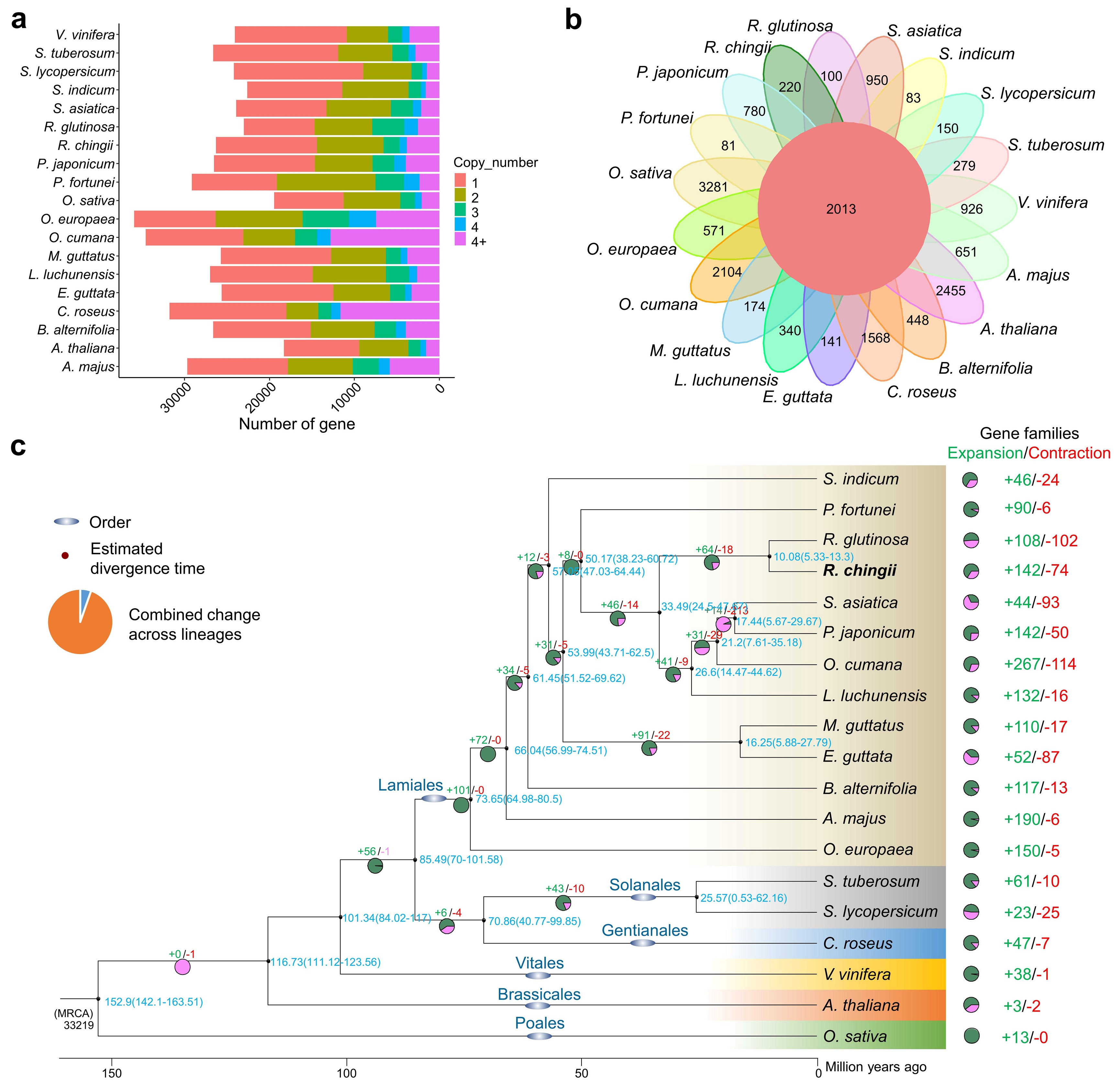 图2 天目地黄比较基因组和进化分析