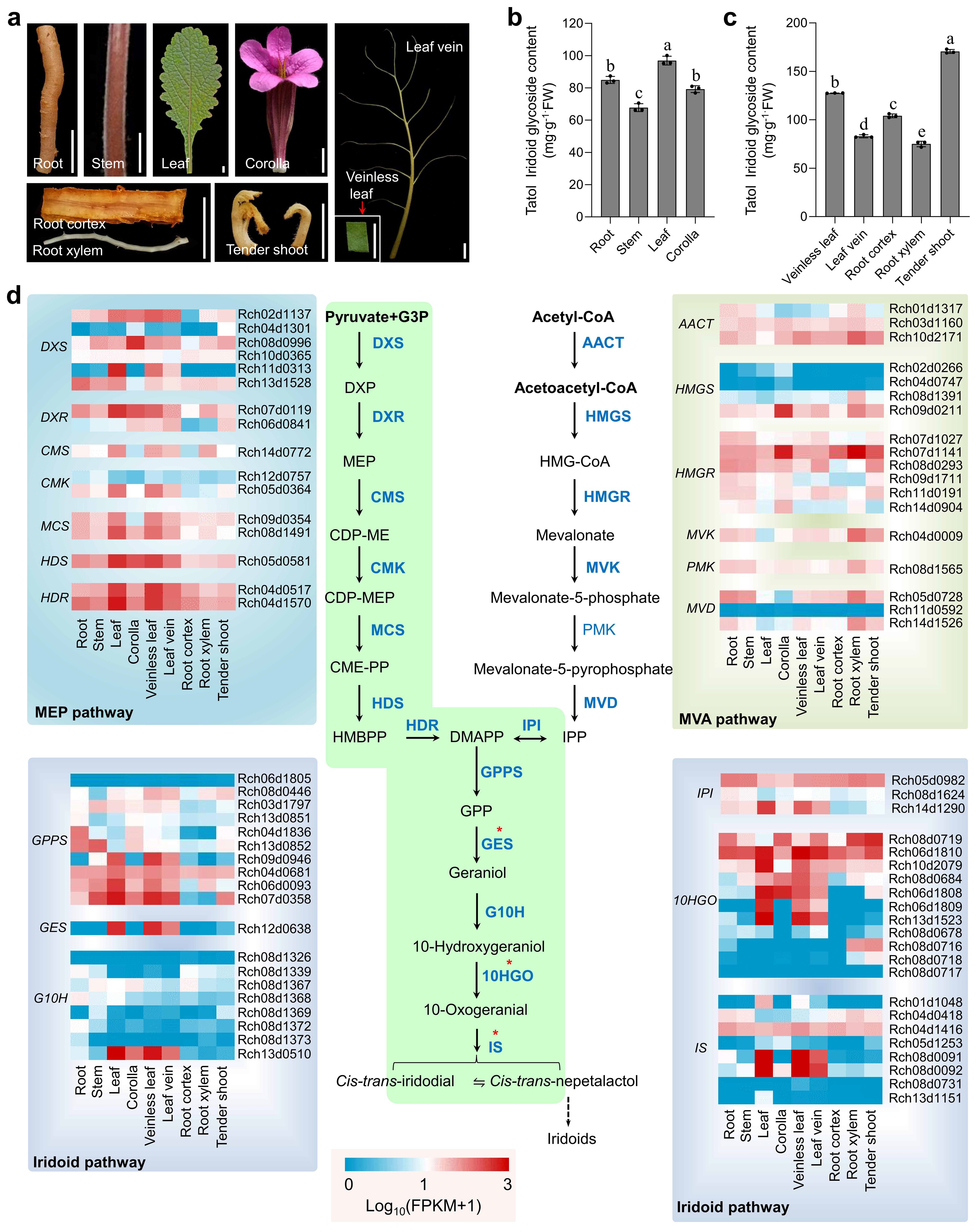 在天目地黄基因组中鉴定到66个参与环烯醚萜合成的催化酶基因。以天目地黄的根、茎、叶、花冠、无脉叶肉、叶脉、根皮部、根木质部和嫩芽为材料进行环烯醚萜苷含量测定和基因表达分析,发现MEP途径基因和环烯醚萜途径基因的表达特性较为一致,均是在叶部位有较高的表达量,而MVA途径基因在花冠和根木质部中的表达量较高,结合不同组织的总环烯醚萜苷含量,推测天目地黄环烯醚萜苷类成分的合成主要由MEP途径基因和环烯醚萜途径基因参与。