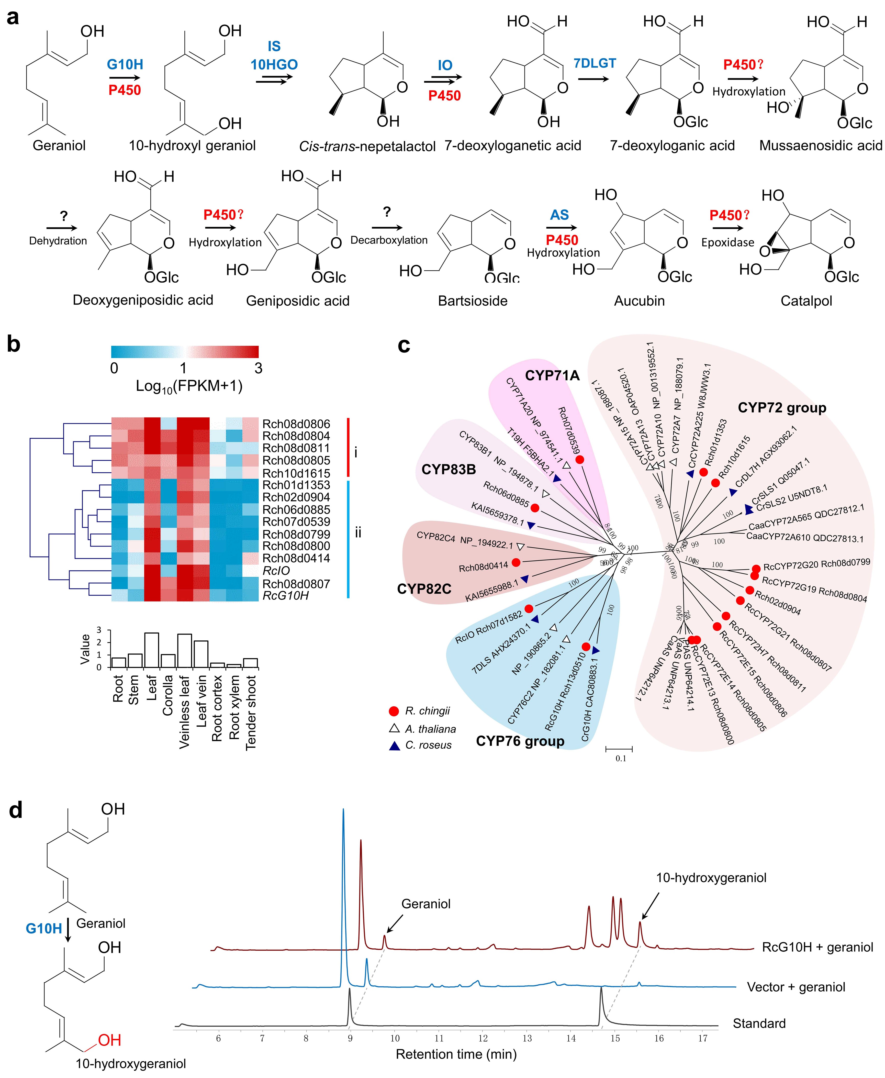 推导了从顺式-反式-荆芥醇开始到梓醇的合成途径,发现细胞色素P450可能参与了氧化、羟基化、环氧化等多步反应。从天目地黄基因组中鉴定出320个候选P450基因,根据表达模式聚类发现类群I的15个基因与环烯醚萜途径基因的表达模式类似,其中包括RcG10H和RcIO。进化分析发现其中10个P450基因编码的蛋白属于CYP72亚家族,RcG10H和RcIO属于CYP76亚家族。并且利用酵母表达验证了RcG10H具有香叶醇-10-羟化酶功能。
