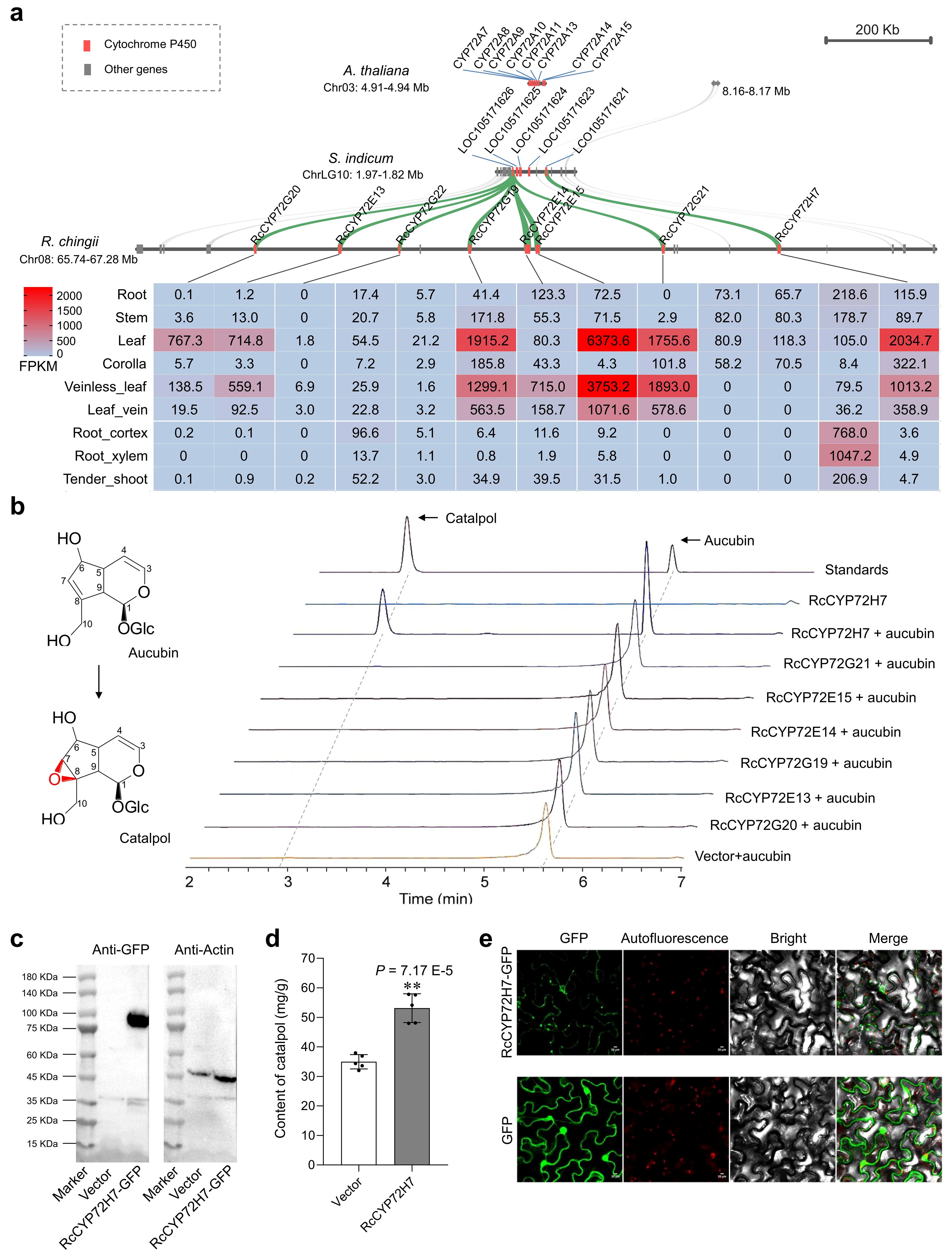 RcCYP72H7的表达可以在烟草叶中特异性地合成梓醇,具有桃叶珊瑚苷C-7、C-8位环氧化功能。进一步在天目地黄中瞬时表达