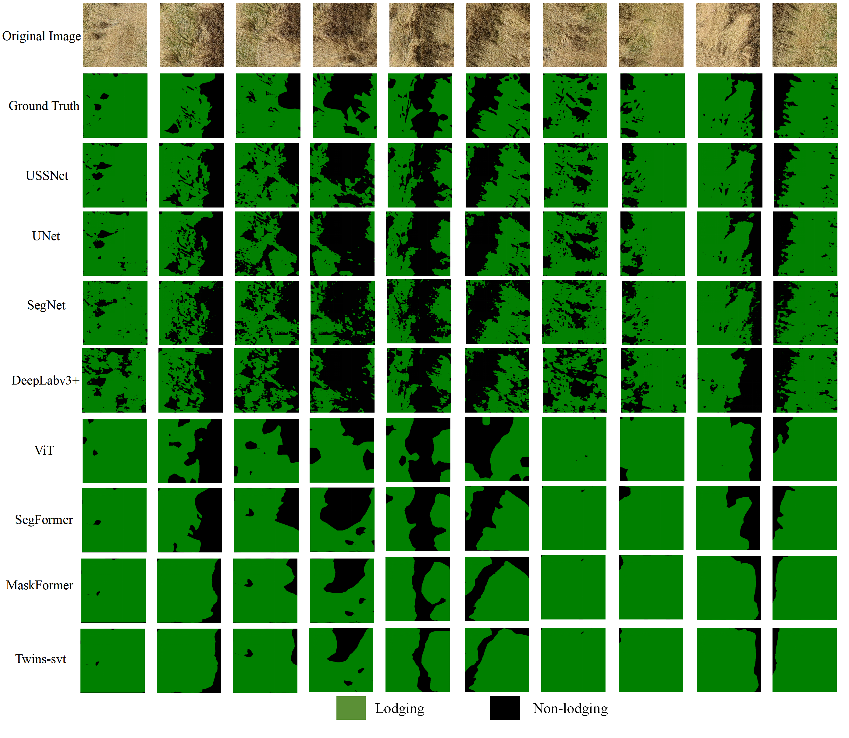 分割结果显示相较于UNet、ViT、SegNet等算法,本研究提出的UssNet网络模型综合考虑了小麦倒伏图像特点和倒伏区域数据分布特性,对倒伏小麦边界的监测精度较高。