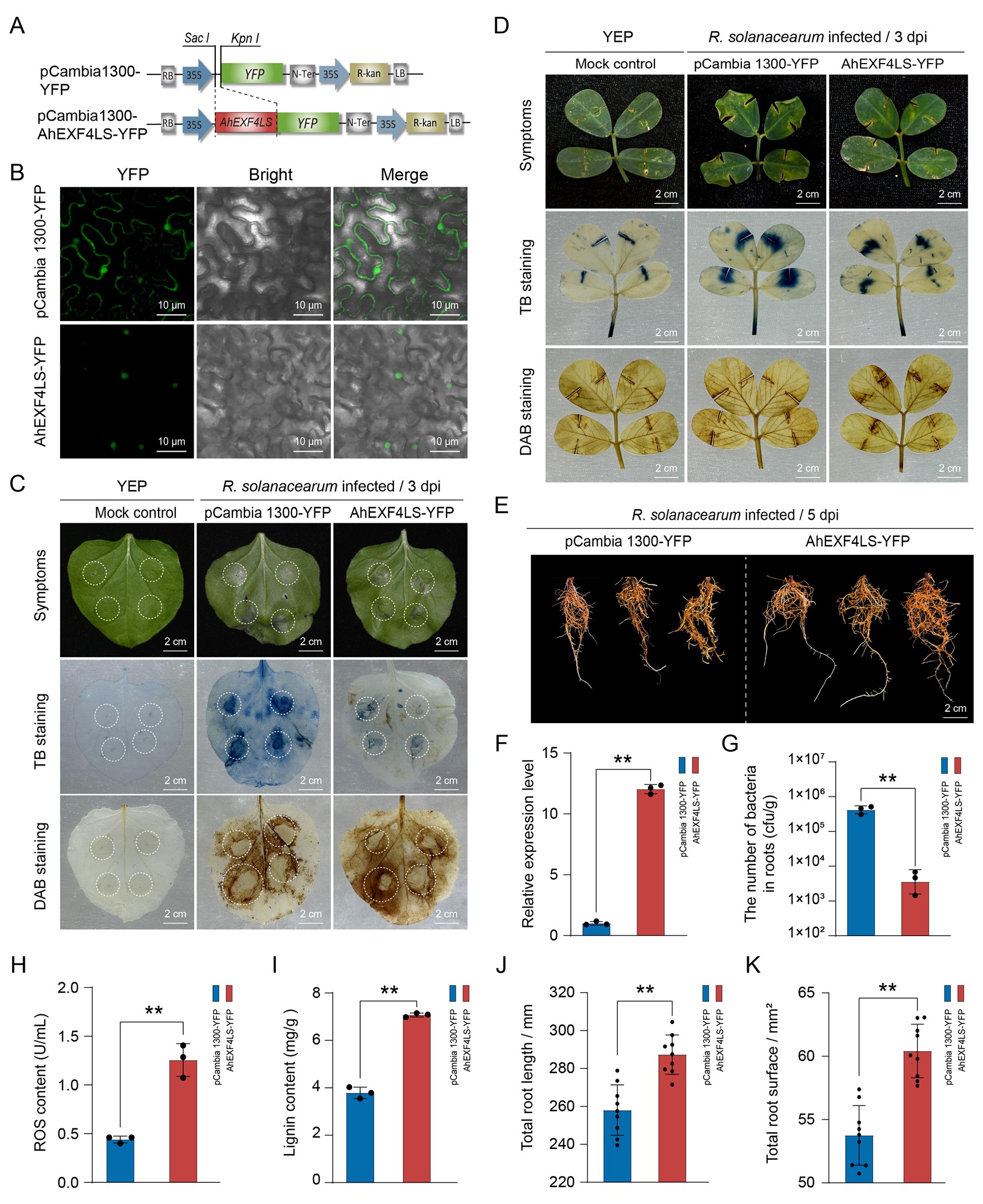 AhEXF4LS在青枯菌侵染后显著上调表达。亚细胞定位分析表明AhEXF4LS-YFP定位于细胞核中。重要的是,在过表达
