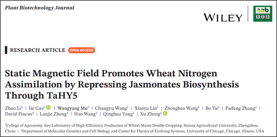 本网讯(通讯员 李卓)近日,我校杨青华教授与郑旭教授团队在植物学领域知名期刊《Plant Biotechnology Journal》发表题为《Static Magnetic Field Promotes Wheat Nitrogen Assimilation by Repressing Jasmonates Biosynthesis Through TaHY5》的研究论文。该研究首次系统解析静态磁场调控小麦氮素高效吸收与同化的生理路径及分子机制,不仅填补作物磁生物学效应在氮素同化领域的关键认知空白,更为物理农业技术开发与作物养分高效遗传改良提供全新理论支撑。