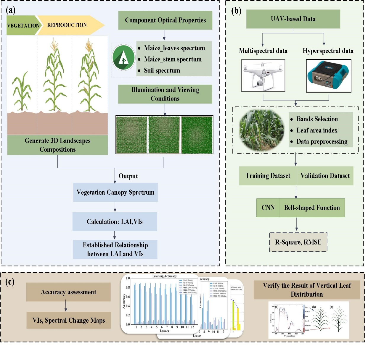 叶面积指数(LAI)是反映作物光合能力与生长状况的关键指标。玉米冠层具有明显的垂直异质性,不同叶层对光谱信号的贡献差异显著,传统遥感方法难以准确监测冠层中下部叶面积信息。本研究构建了不同密度、株型和生育期的玉米冠层三维场景,模拟分析了冠层光谱垂直响应特征,探索了光谱遥感对叶面积信息的探测深度,最后提出了一种融合钟形函数与卷积神经网络(CNN)的FuseBell-Hybrid模型,提升了叶面积垂直分布信息的监测能力。