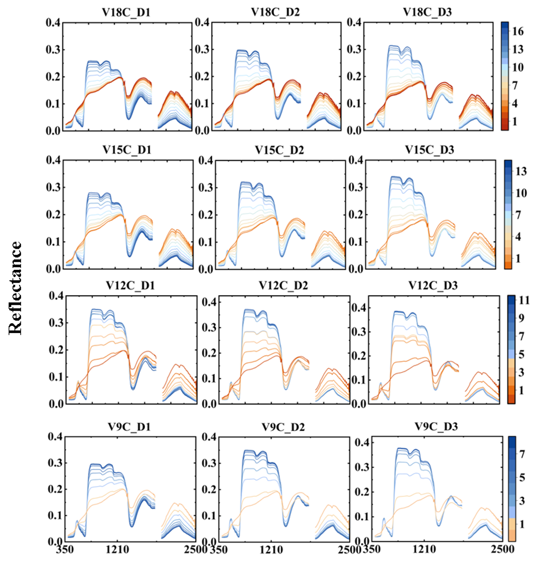 结果表明,遥感传感器对玉米冠层的探测深度随生育期和种植密度变化显著。在苗期,可以探测至底部1–3片叶;抽雄期扩展至1–4片叶;灌浆期进一步深入至1–7片叶。种植密度对冠层底部的探测影响尤为明显,低密度条件下底层叶片对光谱贡献显著,而中高密度条件下其影响大幅减弱。