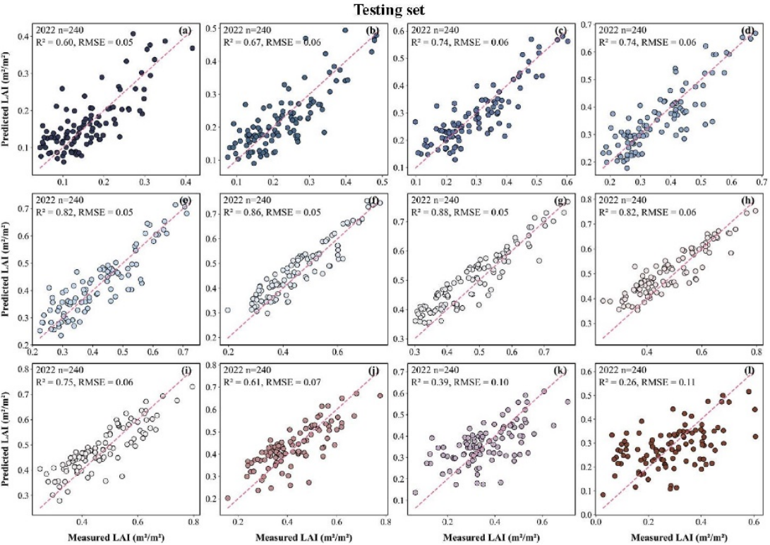 使用多年数据集对模型在不同垂直叶层的性能进行了系统评估。结果显示,模型对冠层中下部叶片的LAI预测精度较高(R² > 0.8),第6-12叶层的监测与实测高度吻合。该研究深化了对玉米冠层结构与光谱响应之间关系的理解,为作物参数垂直分布遥感监测提供了新思路,对变量施肥与智能灌溉等精准农业实践具有重要应用价值。