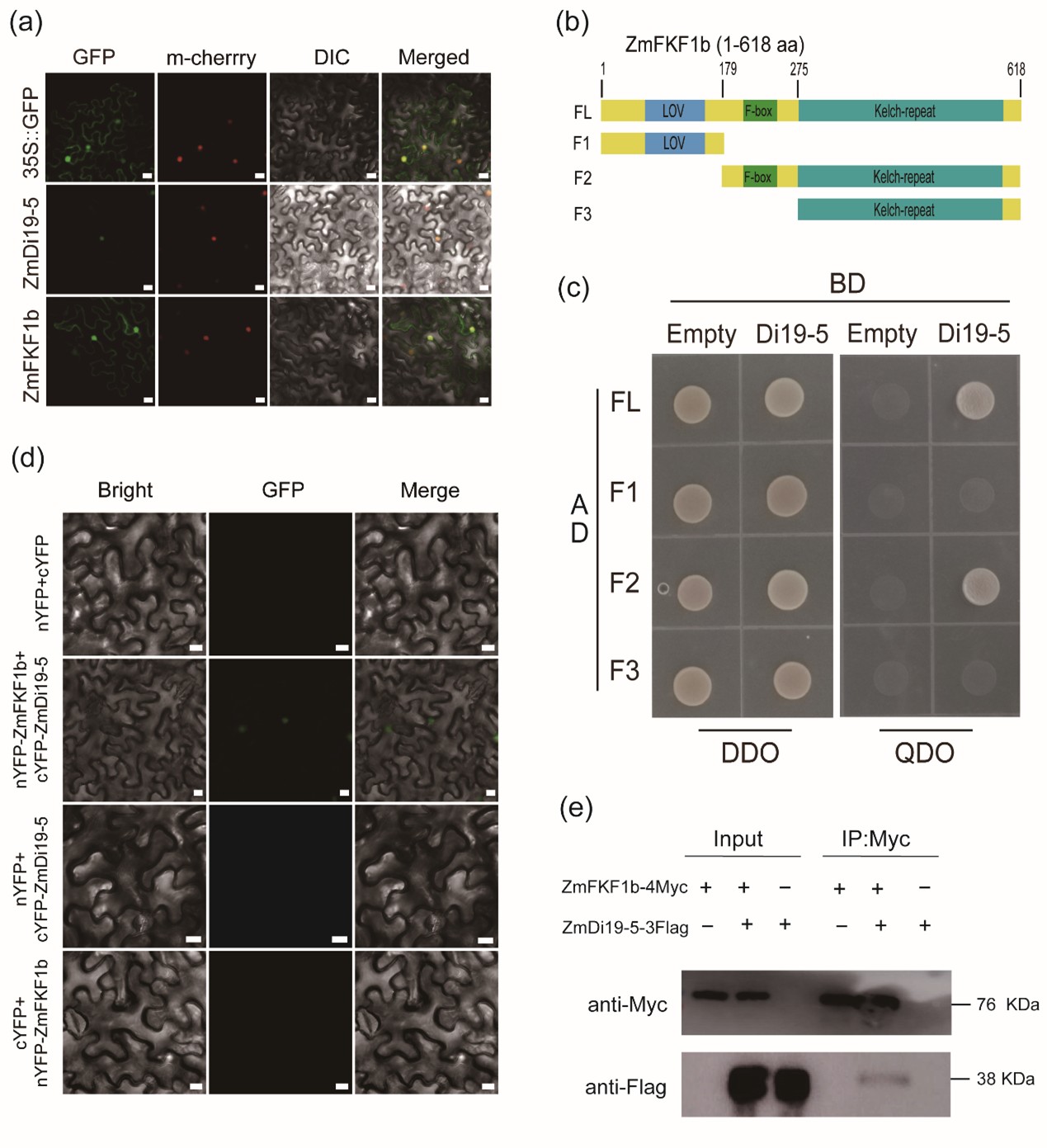 为挖掘ZmDi19-5的互作调控网络,研究者通过对ZmDi19-5进行酵母双杂交(Y2H)筛选发现,ZmDi19-5可以与蓝光受体蛋白ZmFKF1b发生互作作用,通过构建ZmFKF1b不同结构域的截短载体进行互作验证,明确二者的互作依赖于ZmFKF1b的F-box结构域。亚细胞定位结果显示,ZmDi19-5蛋白定位于细胞核内,这为二者在特定亚细胞区域发生互作提供了空间依据;进一步利用双分子荧光互补(BiFC)实验,在烟草叶片的细胞核中观察到荧光互补信号;最终,免疫共沉淀(Co-IP)实验通过特异性抗体捕获复合体,从体内水平再次确认了二者的互作关系,形成了完整的互作验证证据链。