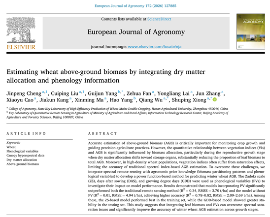 熊淑萍教授团队近日在国际期刊《European Journal of Agronomy》(IF=5.5)在线发表了题为“Estimating wheat above-ground biomass by integrating dry matter allocation and phenology information”的研究论文。该研究提出了一种融合光谱遥感技术与农学先验知识的冬小麦地上生物量估算模型,显著提高了跨生育期冬小麦地上生物量估算的准确性。