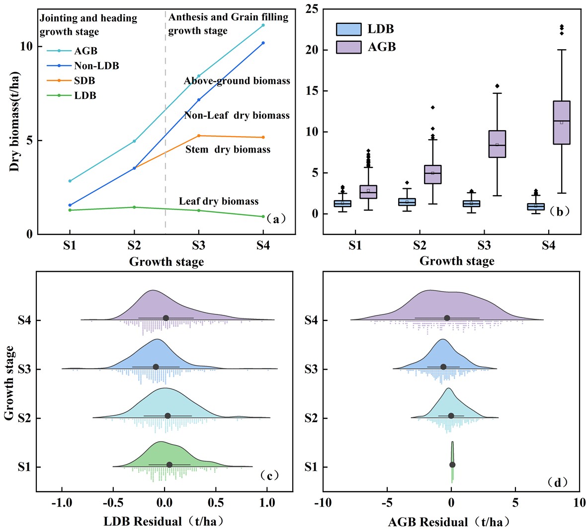 研究发现,在小麦的生长过程中,随着植物由营养生长期转向生殖生长期,干物质的分配发生了显著变化。特别是在生殖期,干物质会转移到生殖器官,叶片干重几乎不再增加反而减少,导致传统光谱遥感方法的预测精度下降。叶片生物量的总体残差在不同生长阶段保持相对稳定,说明叶生物量受物候的影响较小,而地上生物量的残差在灌浆期表现出更广泛的分布。因此,在构建耦合模型时将物候变量作为约束条件是必要的。