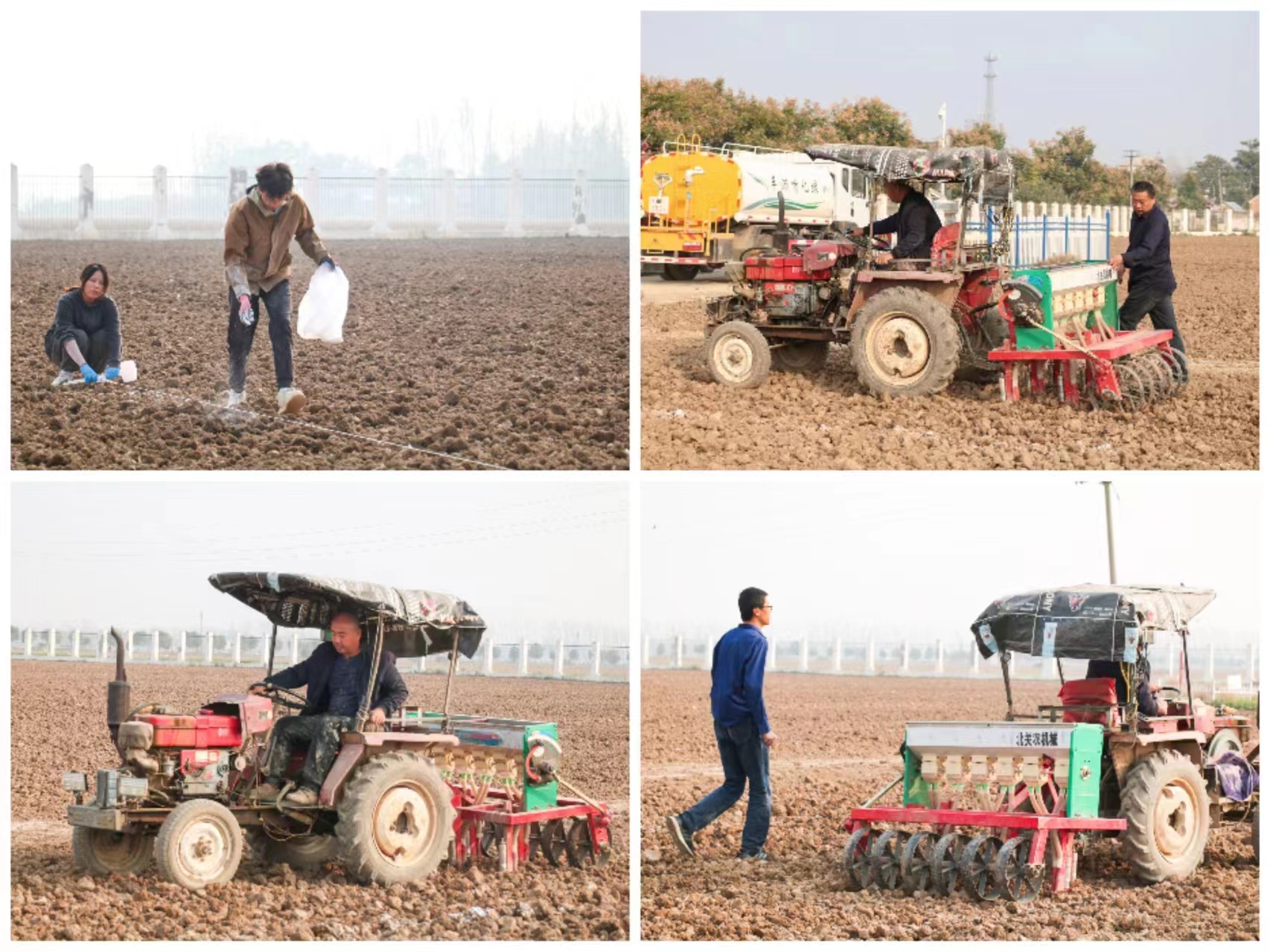 步入豫东综合试验站新品种示范展示中心,师生们忙碌的身影在农田里来回穿梭,他们协同配合,拉绳、标记、作畦、画小区;确认播种量、检查开沟器行距、调整开沟覆土镇压轮的深浅、将小麦种子倒入排种盒……完成一系列准备工作后,轰隆隆、轰隆隆,播种机在大家的注视下进入播种试验小区,播撒下的种子承载着来年丰收的希望,更装载着农业蓬勃发展的未来。谢迎新研究员为大家详细介绍了试验站展示中心设置的小麦播期试验、小麦病虫害生物防治试验和小麦新品种比较试验,研究内容主要集中在小麦产量形成、水肥利用效率、生物与非生物灾害防控等方面,并在田间对a片直播