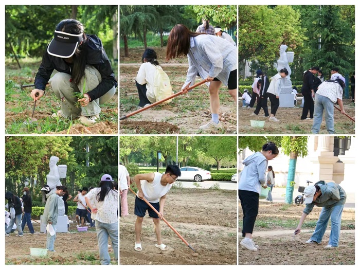 中药学专业本科生参与龙子湖校区菊花种植活动。