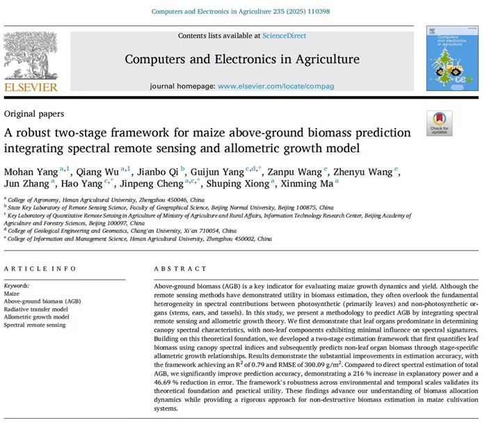 2021级智慧农业专业本科生杨默含,凭借扎实的专业知识与不懈的探索精神,以第一作者身份在中科院一区TOP期刊《Computers and Electronics in Agriculture》(IF=7.7)上发表了题为《A Robust Two-Stage Framework for Maize Above-Ground Biomass Prediction Integrating Spectral Remote Sensing and Allometric Growth Model》