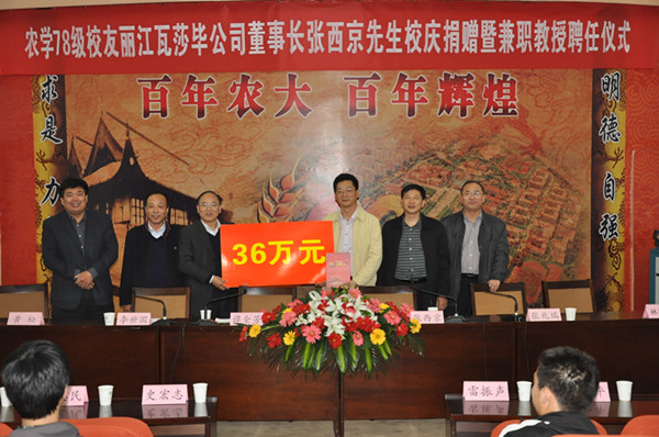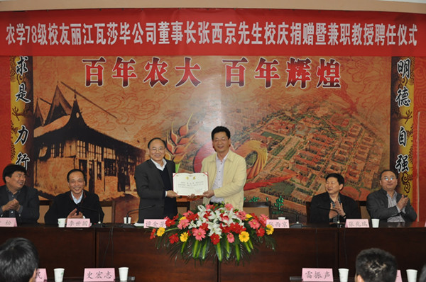 2012年4月12日下午,农学78级校友丽江瓦莎毕公司董事长张西京先生校庆捐赠暨兼职教授聘任仪式在三百人报告厅隆重举行。副校长、校庆筹委会副主任谭金芳出席,校庆办公室常务副主任李世国、计划财务处处长张兆瑞、a片直播