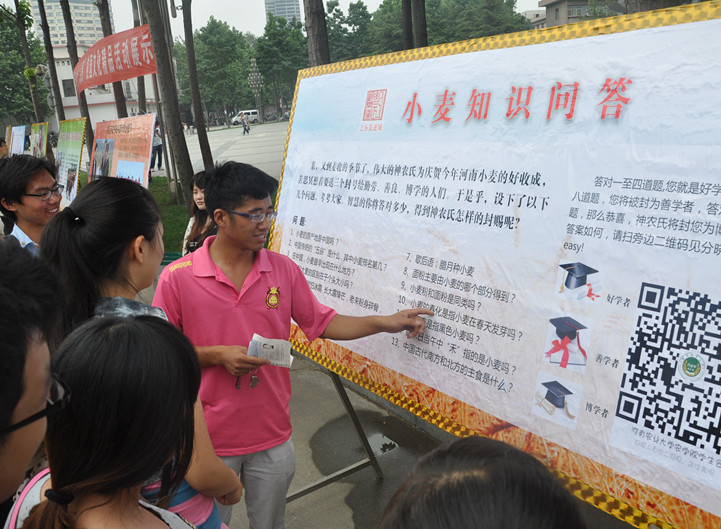 活动以“弘扬农耕文化 传播科技知识 点亮青春梦想”为主题。展示现场,“小麦知识问答”、“不同种类小麦粉的不同用途”、“小麦的十一个生长期”、“小麦的微观世界”等一幅幅展板展示了小麦的种植历史、生长知识、分类和重要应用价值,引起了过往行人的极大兴趣,大家纷纷驻足观看。