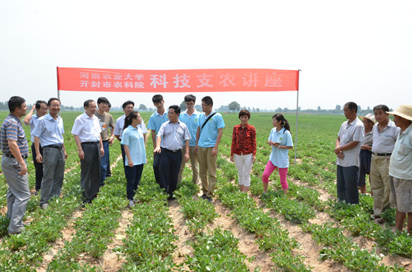 仪式结束后,褚金海一行在谷建中的陪同下来到开封县半坡店乡常庄村,看望慰问正在此开展科技帮扶活动的大学生,现场了解并指导实践活动的开展。褚金海饶有兴致的与现场的学生及农民朋友交谈,对当前花生结荚期间的灌溉和病虫害防治情况进行详细了解。科技帮扶团成员向褚金海汇报了两周以来在开封尉氏县、杞县及开封县进行的当地作物种植规模、机械化程度、选种施肥用药及待解决问题的相关调研和农技推广情况。褚金海对学生的实践成果表示肯定并对他们提出殷切期盼:“a片直播