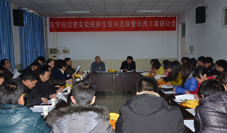 在17号楼405会议室召开绍骙实验班师生双向选择暨培养方案研讨会。学院负责人、17位作物学学科相关专业的导师及2012级绍骙实验班全体学生参加。研讨会由院党委书记黄松主持。