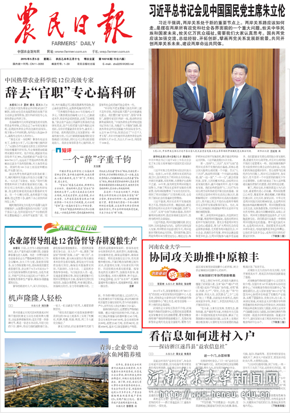 编者按:党的十八大以来,中央对实施创新驱动发展战略作出了一系列战略部署。根据中宣部要求,农民日报结合自身特点开展了“创新驱动兴‘三农’”专题宣传报道活动。该项活动在全国13个省(直辖市)选取了13个农业科研院所或农业大学,重点宣传他们在深化体制机制改革、实施创新驱动发展战略方面的突出亮点,宣传他们的典型经验、成功做法、有益探索及生动实践。我校由于在协同创新、支撑国家粮食安全方面的突出贡献,名列其中。5月5日,农民日报在头版显著位置以“a片直播