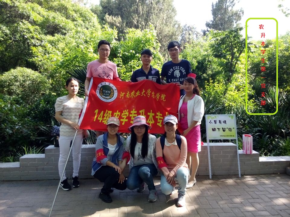 14级农升本学生党支部在郑州市人民公园开展了以“绿色梦想,文明生活”为主题的特色志愿活动,支部党员用实际行动向社会宣传“保护环境,人人有责”理念,引导大家善待环境,文明生活,为建设美丽郑州市容市貌做贡献。