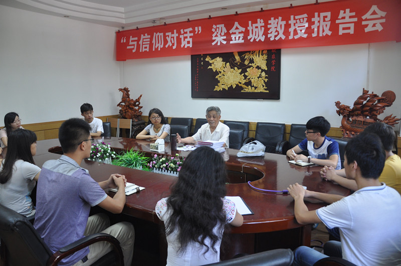 在17号楼208会议室举办“与信仰对话”梁金城教授报告会。国务院“有突出贡献专家”、原农学系主任、院党建特邀组织员梁金城教授以“坚定信仰 圆梦中华”为题,为13名拟发展上了一堂特殊的党课。