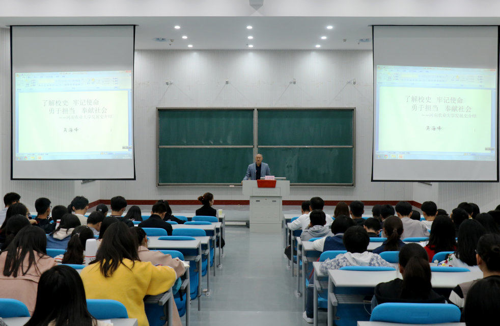 在龙子湖校区教学楼大教室二举行了校史校情报告会。校关工委吴海峰教授作为主讲人,为学院2018级新生作以《了解校史 牢记使命 勇于担当 奉献社会》为主题的报告。报告会由辅导员李盼主持。