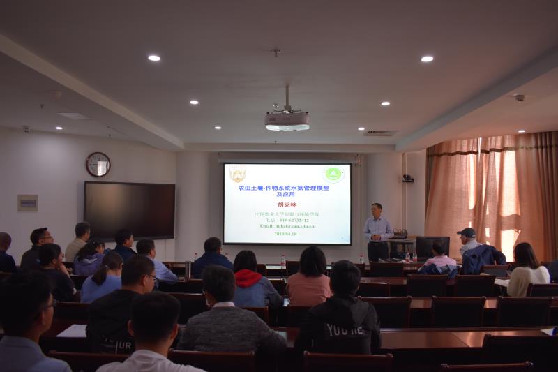 胡克林教授首先介绍了我国农业生产面临的主要问题,然后介绍了农田水碳氮过程及作物生长过程耦合模型构建,之后又介绍了不同种植制度对作物生长及水氮利用效率的影响,最后,胡教授通过讲述设施菜地氮素去向及蔬菜生长过程模拟和稻田氮素迁移过程与水稻过程模拟讲述了模型的应用。报告结束后,胡克林教授与在座师生展开了讨论,对于大家的疑问,作了耐心细致的解答,本次讲座给大家提供了良好的科研思路,大家受益匪浅。(图文/张颖蕾)