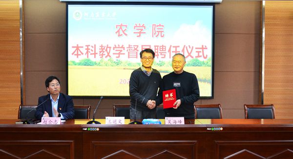 最后,学院举行了本科教学督导聘任仪式。王道文为新任本科教学督导吴海峰老师颁发聘书并合影留念。