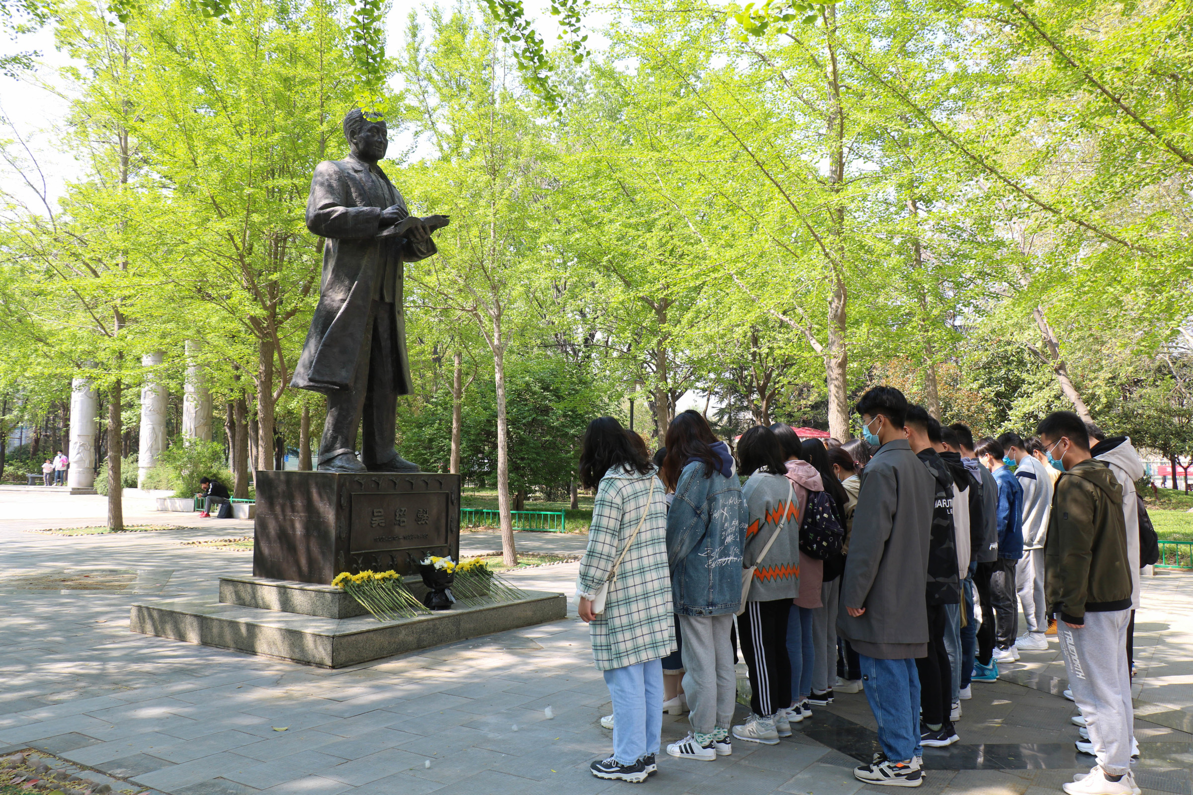 离开二七纪念馆后,大家来到文化路校区,在作物育种学家吴绍骙老先生铜像前肃立鞠躬、敬献鲜花,并擦拭铜像,同学们用实际行动表达一份朴素真挚的敬意。众人回顾了吴老的生平事迹和卓越贡献,向吴绍骙爱国敬业、献身科学、勇于创新的时代精神致以崇高敬意。