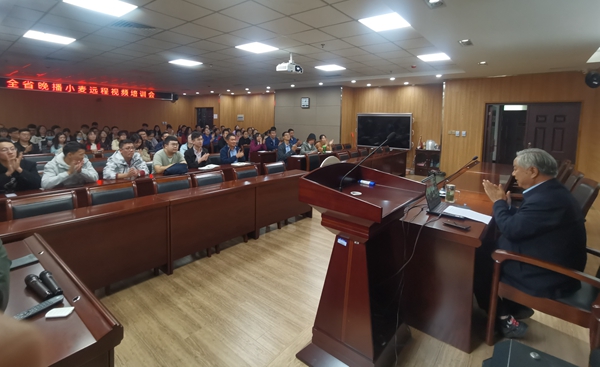 郭天财教授以远程视频方式对全省农业技术推广人员进行了应对小麦晚播的应变栽培技术培训,重点分析了当前我省小麦播种存在的各种困难问题,提出了应因地制宜,分类施策,制定不同类型麦田播种技术对策和全省小麦晚播条件下高质量种足种好小麦应特别注意的几个问题。a片直播