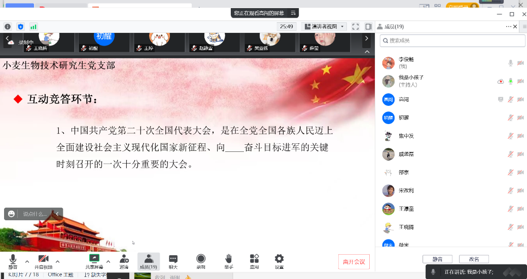 在“二十大知识互动竞答”环节,通过互动答题的形式,帮助大家学习解读党的二十大报告。竞答题目紧密围绕党的二十大报告提出的新理念新战略新论断,系统全面阐释了二十大报告的主要内容和核心要义,有助于广大党员干部群众深入学习领会党的二十大精神的丰富内涵、精神实质、重大意义。二十大知识互动竞答活动气氛活跃,得到了大家的积极响应,同志们异口同声,纷纷开麦回答,表示受益匪浅。