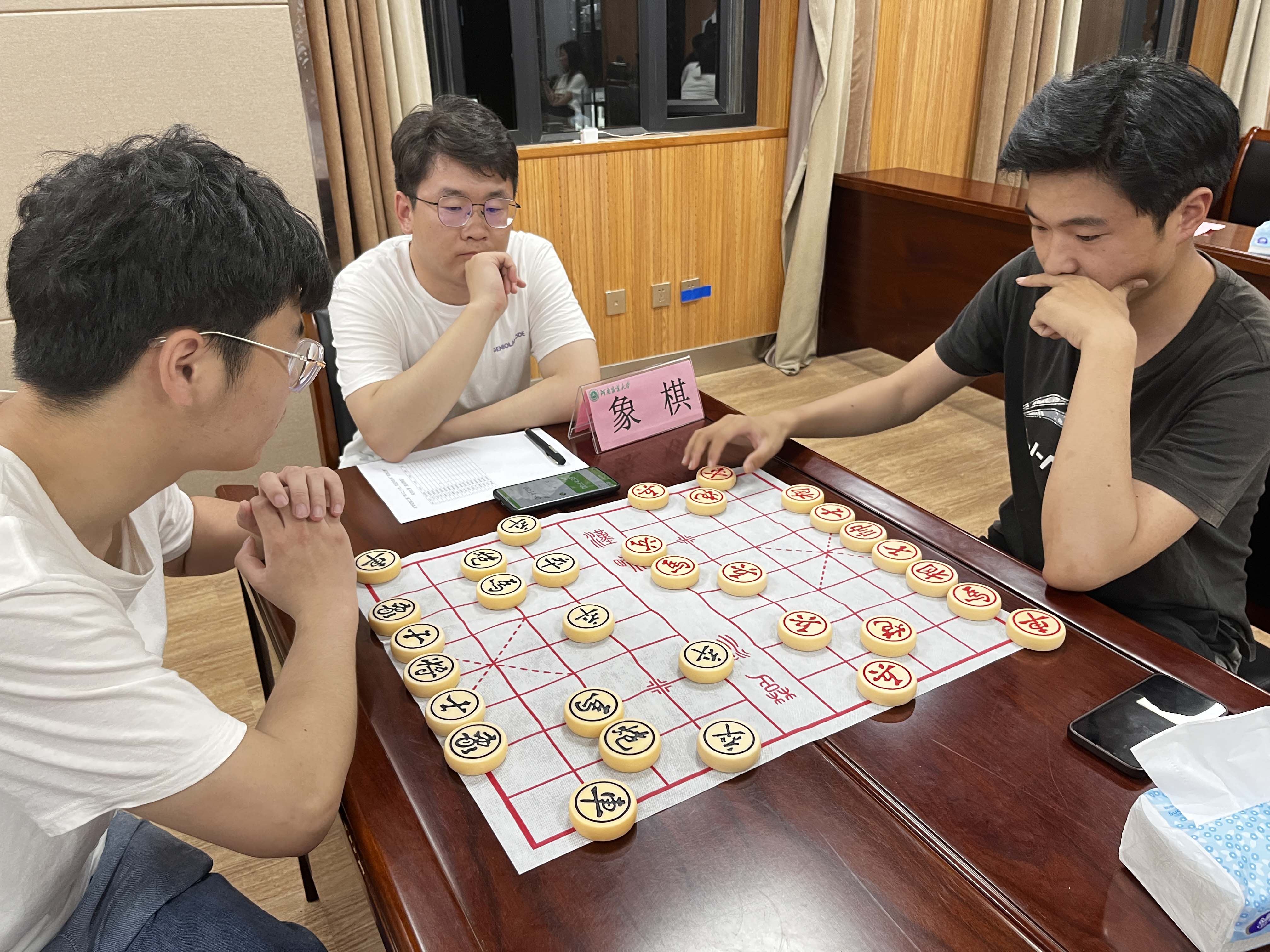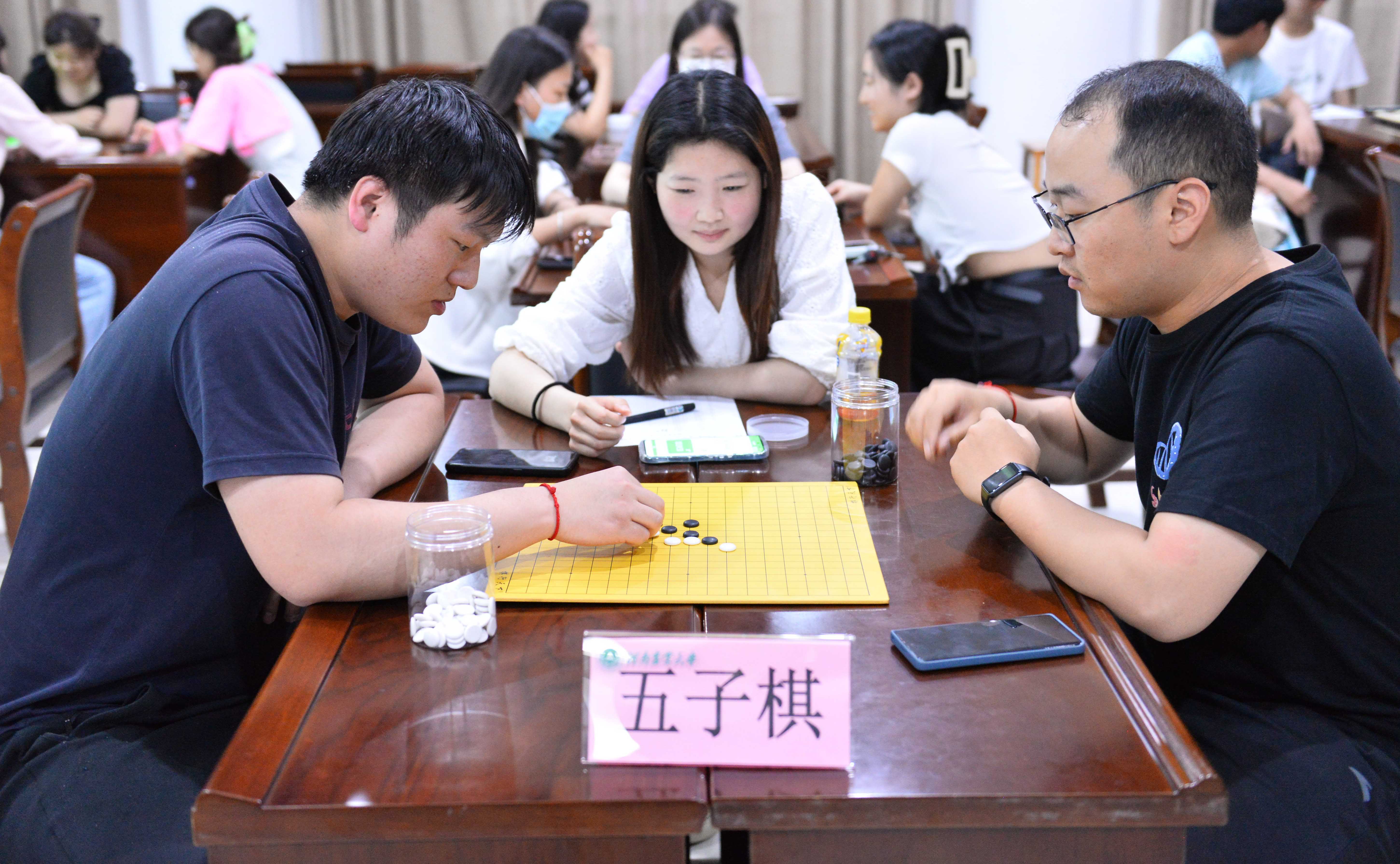 本次比赛共设置了五子棋、象棋、跳棋三个组别,分为初赛、复赛两个阶段,采取淘汰制规则。棋盘博弈,智谋比拼,比赛中同学们凝眉思索,沉着冷静,或调兵遣将,或跃马扬鞭,或斜飞正跳,或妙算嘉谋。每张桌子都成为了“战场”,落子声此起彼伏,跳棋选手们精心布局,巧妙搭桥;象棋兵来车往,激烈厮杀而顾全大局;五子棋你堵我截,或雷厉风行,或精雕细琢,营造出一种“金戈铁马扫千军,羽扇纶巾棋人生”的氛围。