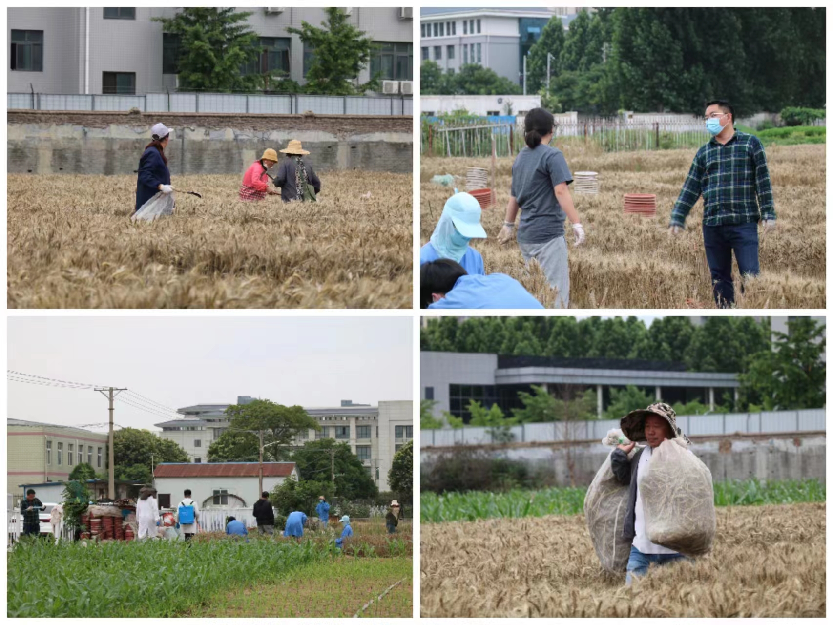 老师和学生参与小麦收割