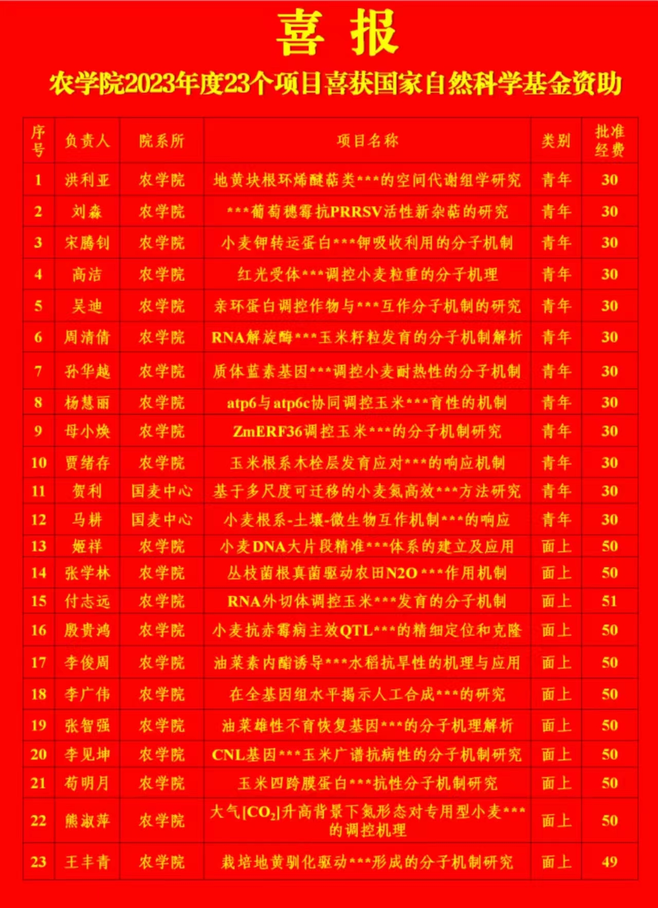 2023年度共获得批准项目立项23项(含国家小麦技术创新中心2项),其中面上项目11项,青年基金项目12项,获批数量首次达到20项,直接经费总额910万元。