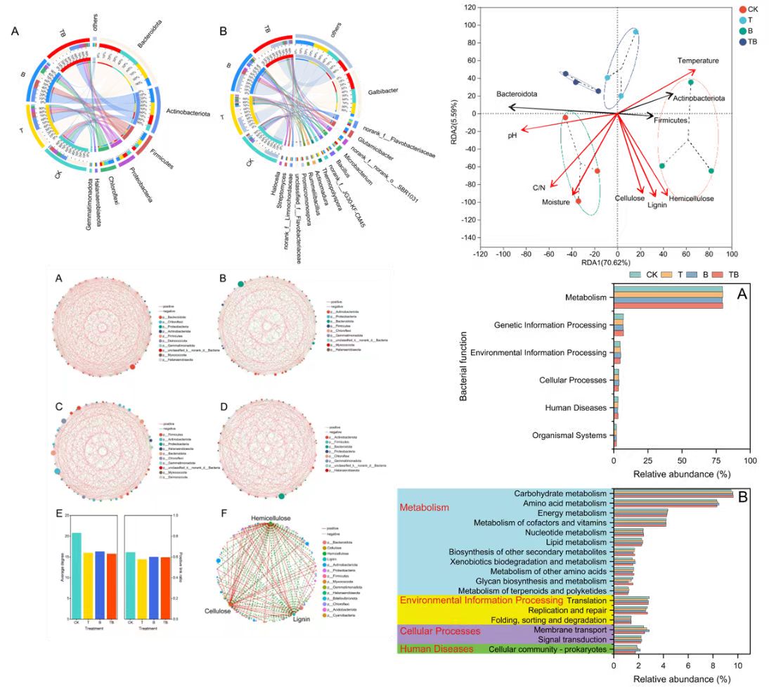 Bacillus subtilis)共接种对堆肥效率和木质纤维素降解的调控效果。结果表明,木霉菌和芽孢杆菌共接种提高了拟杆菌门的丰度,碳氮比和pH提前达到成熟标准。此外,在单独接种木霉菌或芽孢杆菌处理中,放线菌门和厚壁菌门仍然主导着堆肥后期木质纤维素的降解。细菌功能预测分析表明,碳水化合物代谢是主要的代谢途径。综上,木霉菌和芽孢杆菌共接种缩短了堆肥周期,加速了木质纤维素的降解,为高效利用玉米秸秆生产生物有机肥提供了新的策略。这些发现对于促进农业废弃物资源化利用和推动农业绿色发展具有重要意义。