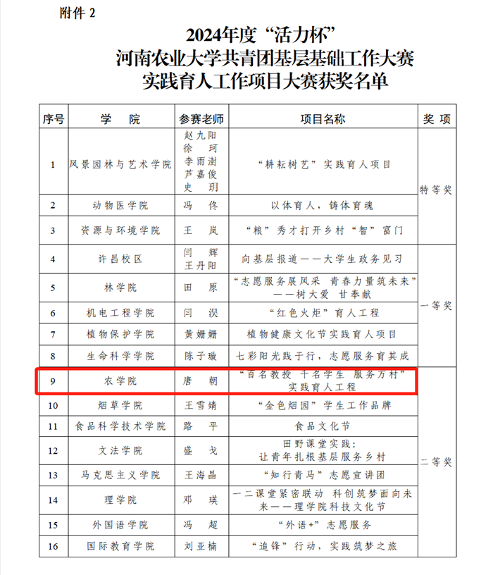 “百名教授 千名学生 服务万村”实践育人工程荣获二等奖。