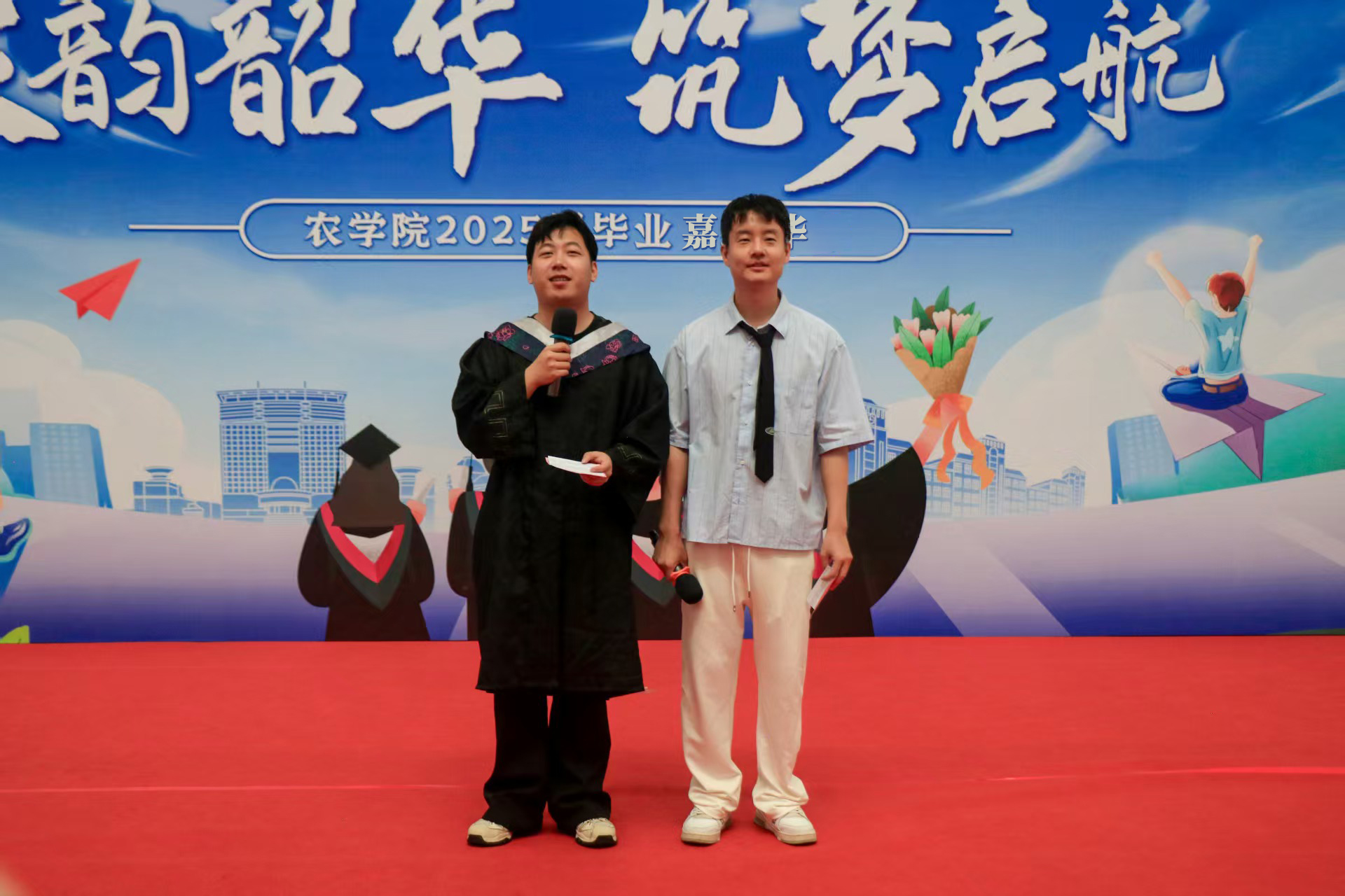 本次毕业嘉年华充分融入农大特色与农学元素。街舞燃情、歌声动人,多元艺术表演热力开场,点燃了现场热烈的气氛,一首首青春歌曲诉说同窗深厚情谊。学院领导老师们为毕业生逐一送上极具农学特色毕业礼物:金灿灿的“粮袋子”和精美的青花瓷、钧瓷“农大碗”。这些礼物不仅寓意着学院对毕业生幸福、平安的祝福,也彰显着“抗稳中国粮袋子”“把中国人的饭碗牢牢端在自己手中”的农学人使命担当,希望毕业生们如这瓷器般历经淬炼而坚韧,如稻穗般扎根大地而饱满,带着农院人顶天立地的风貌,在乡村振兴、农业现代化的征程中盛放光彩。