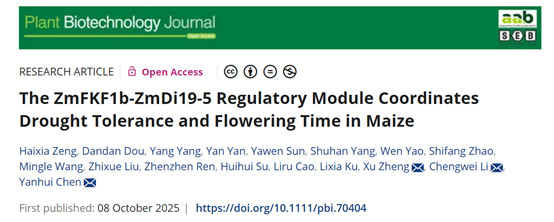 近日,我校a片直播 陈彦惠、李成伟、郑旭团队在《Plant Biotechnology Journal》上联合发表了题为“The ZmFKF1b-ZmDi19-5 Regulatory Module Coordinates Drought Tolerance and Flowering Time in Maize”的研究论文。该研究首次揭示了玉米中的干旱诱导蛋白ZmDi19-5具有调控干旱耐受性与开花时间的双重功能,且该蛋白可与ZmFKF1b蛋白互作并形成复合体,通过调控下游干旱靶基因ZmHsf08和开花靶基因ZmCOL3的表达,精准实现玉米干旱耐受能力与开花时间的动态平衡。