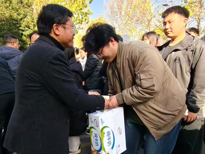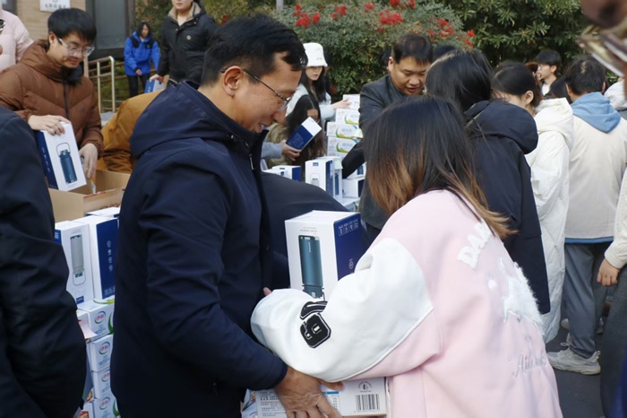 随后,领导老师们与志愿者们有序为2022级全体学生发放冬季暖心礼包,礼包内牛奶寓意学院祝福每一位考研学子“牛气冲天,一举上岸”!保温壶寓意学院会为每一位农宝“保驾护航,温暖相随”!每一份礼品上都暖心的贴着学院师生亲笔书写的“农院护航,金榜题名”“暖在寒冬,爱在农院”“寒冬送暖,情系农院”等暖心寄语,承载着学院的牵挂,传递着冬日里的温情。学子们接过礼包,脸上洋溢着感动的笑容,现场掌声不断,暖意十足。